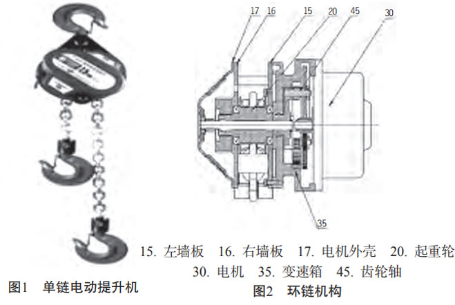 雙鉤單鏈電動提升機的機構如圖1所示,主要由機頭、上吊鉤、電機、起重量、鏈條、第一下吊鉤、第二下吊鉤、導輪、保險卡、支桿等組成。