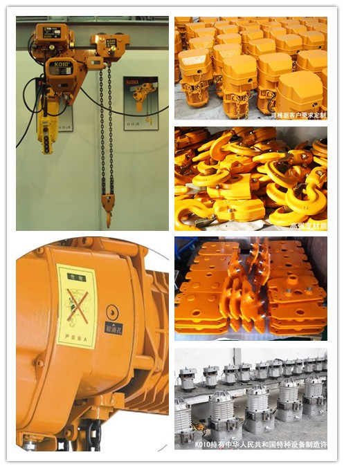 極限開關:重物吊上吊下都有極限開關裝置,使電機自動停止,以防止鏈條的超出,確保安全。